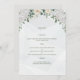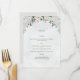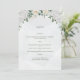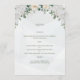 Die Karte des Menüs hat einen sanften, eleganten Stil mit Pastellfarben, die von Grün- und Weißtönen dominiert werden. Oben befindet sich eine wunderschöne Mischung aus Blume in Weiß und Creme, einschließlich Rose und anderen zarten Blüten, vermischt mit grünen Blätter. Das Design ist durchdacht und romantisch, ideal für eine Hochzeitsfeier.