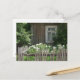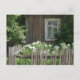 Ein Foto mit einer Hütte aus Holz mit einem Fenster und einem Garten voller weißer Rosen.