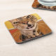 Eine humorvolle kleine Katze sitzt auf einem Untersetzer