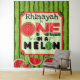 Sweet & Trendy First Birthday Design! Grünes Watermelon Rind Muster Hintergrund mit Niedlichem rötlich/rosa Wassermelone Fleisch ONE in einer Ecke geschnitten zentrierten Rahmen. Abgeschlossen mit einer Wassermelone-Scheiben am Boden. Ideal für den Sommer und Wassermelone zum ersten Geburtstag. Verwenden Sie als Foto Hintergrund oder Geburtstagsparty Dekoration Brennpunkt. ©2022 Miss Sassy Party Designs