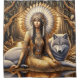 In einer ruhigen Waldlandschaft sitzt eine indische Indianerin, die in faszinierender traditioneller Kleidung verziert ist, anmutig neben einem majestätischen Wolf