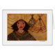 Eine indische Frau mit farbenfrohen Schatten und heller goldener Sonne im Hintergrund und zwei Tepees.