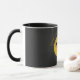 Niedliche Halloween modifizierte Kunst Kaffee-Tasse bietet Vintages Schulmädchen, das auf dem Besen mit Hexenhut, schwarzer Katze und goldenem Vollmond sitzt. Text: Es gibt eine kleine Hexe in uns allen.