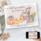 Ein kleiner Kürbis ist auf dem Weg, Fall Schwangerschaft Ankündigungskarte - einfach zu personalisieren mit Ihrer Nachricht und Baby Fälligkeitstermin. Die rustikale Aquarellgestaltung hat eine Landporchszene mit einem Schaukelstuhl, Korb aus Holz, Krug aus Weizen und eine Ernte von Kürbissen aus dem Land. Es hat einen rot-grünen WaschHintergrund mit rosa Schaukelstuhl und ein kleiner Kürbis ist auf ihrem Weg ist in elegantem handgeschriebenem Skript geschrieben.