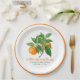 Ein einfaches Design für eine Babydusche mit Orange/Süsse Thema. Nur ein Zitruszweig mit grünen Blätter und zwei Orangen. Mit dem Titeltitel "Eine kleine Süsse ist unterwegs", unter dem Zweig, in einem orangefarbenen extravaganten Drehbuch, und der Name und der Anlass und das Datum darunter, in kleinen schwarzen Kappen. An der Grenze ist ein orangefarbener Kreis.