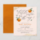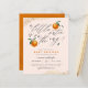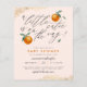 Eine kleine Süsse ist unterwegs! Feiern Sie die Mutter-zu-be mit diesem Design, das diesen Satz in eleganten Schriftzeichen mit handbemalten Orangen und grünen Blätter vor einem rot-rosa Hintergrund darstellt. Ihre Duschdetails erscheinen unten in der modernen Typografie. Es gibt Imitate goldenen Glitzer in den oberen links und unteren rechten Ecken.