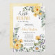 "Eine kleine Wildblume ist unterwegs" Babydusche mit Gänseblümchen, sediertem Eukalyptus und Lavendelfloralen vorne mit einem koordinierenden Bouquet auf einem gewaschenen gelben Aquarell mit schlängelgrünen, winzigen Polka-Punkten. Ideal, um den Frühling bis zum Frühsommer mit der Babydusche zu feiern.