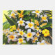 Die Blume der weißen und gelben Plumeria sind von üppig grünen Blätter umgeben, das Set ist in hellgelben Farbtönen gehalten. Die Komposition strahlt eine tropische und lebendige Atmosphäre aus, die die Schönheit und das Diversity der Flora der Natur unterstreicht.