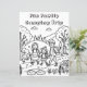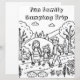Niedliche Farbseite mit einem Camping-Thema. Eine Familie, die auf ihrem Camping durch die Wanderwege durch Bäume und Berge geht. Niedliche Farbseite für Groß und Klein.