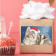 Eine Niedliche Katze, die einen Weihnachtsschnee in roter Weihnachtsmannmütze trägt