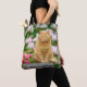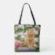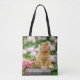 Eine bezaubernde Ingwer-farbene Tabbierkatze sitzt auf einem Holzfass inmitten wunderschöner Frühlingsblumen, rosa Tulpen und weißem Rhododendron, in einem blühenden Garten. Foto von Katho Menden aufgenommen. Diese Tasche ist eine Geschenkidee für Katzenliebhaber.