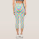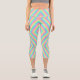 Eine Person trägt lebendige, farbenfrohe Leggings mit einem geometrischen Regenbogenmuster und steht vor einem einfachen Hintergrund. Die Stimmung ist lebendig und energiegeladen.