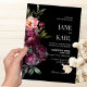 Ein Blumenstrauß mit reichhaltigem, dramatischem und launenhaftem Torondesign. Diese Hochzeitseinladung ist in kühnen und dramatischen Farbtönen gestaltet und fügt jeder Hochzeitsfeier mehr als eine Touch Glamour hinzu. Tiefe, launenhafte Flora und Fauna rufen eine romantische Atmosphäre vor dem dunkelschwarzen Hintergrund hervor.