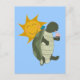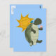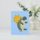 Eine Schildkröte genießt an einem warmen Tag eine Eistüte im Mixed Media Image auf dieser Postkarte. Die grüne Schildkröte sitzt aufrecht und die Beine sind ausgestreckt. Er hält einen Waffelkonus mit Eis, der mit bunten Sprinklen bedeckt ist. Das Lächeln auf seinem Gesicht, während er die gefrorene Leckerei leckt, zeigt seine Zufriedenheit. Ein blauer Schmetterling hat auf seiner Muschel angezündet und auf beiden scheint eine lächelnde Sonne. Aus meinem digital erstellten Original-Bild.