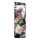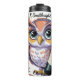 Diese seltsame grafische Abbildung zeigt eine stilisierte Eule mit großen, ausdrucksstarken Augen und ruffelnden Federn, die eine Flasche Wein mit ihrem Talon hält. Der Text auf dem links lautet: "Nimm mir keinen Rat, DU wirst NUR BETRUNKEN enden." Die Kunst hat einen lustigen, skurrilen und sehr humorvollen Ton.