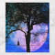 Fantastischer Vollmond in lila Farbtönen und kobaltblauer Himmel mit einer schwarzen Katzenkatze auf Draht