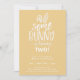 Niedliche "etwas Bunny" Geburtstagsfeier in staubgelber Farbe. Weiße Typografie mit sonniger Ohrakzent und handgezeichnet Korbflechtmuster-Rückenlehne.