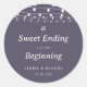 Ein süßes Ende zu einem neuen Hochzeitsticker mit klassischem Rundaufkleber ist perfekt für eine einfache Hochzeit. Das Design weist weiße Saitenleuchten in einem lila Hintergrund auf.