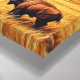 Eine wunderschöne Landschaft mit zwei Bisons, die durch ein Feld von großen, goldenen Gras gehen. Der Himmel ist ein leuchtendes Blau mit flauschigen weißen Wolken, und im Hintergrund kann man eine weite Bergkette mit schneebedeckten Gipfeln sehen. Der Gesamteindruck ist von Ruhe und Ruhe geprägt.