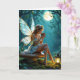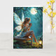 Eine märchenhafte Themenkarte, die einem Freund oder einem Familienmitglied einen guten Tag wünscht, mit einer Fee, die auf einem Pilz sitzt, in einem bezaubernden Wald, beleuchtet von Laternen, die eine warme Tasse Kaffee trinken. Die hübschen Bäume sind von funkelnden Märchenlichtern bedeckt, und ein Vollmond strahlt durch die Äste des Baumes.