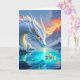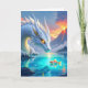 Eine surreal sci fi Karte, um einem Freund oder Familienmitglied einen magischen Tag zu wünschen. Eine schöne Abbildung weißer Drache, der einen Goldfisch anschaut, während Vulkane im Hintergrund ausbrechen.