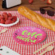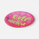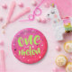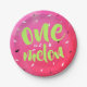 Helle Sommerpapierplatte mit süßer und frischer rosa Wassermelone, Samen und Text "One in a Melon".
