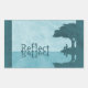 Ein grün-blau strukturierter zeichn mit der Silhouette eines Mannes, der unter einem Baum sitzt, durch einen Teich, der darüber nachdenkt. Das Wort "Reflektieren" Erholungen auf der Seeoberfläche, Text und Schatten, die sich im vollkommen stillen Wasser widerspiegeln.