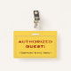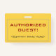 Dieses einfache Abzeichen-Design beinhaltet die Meldung "AUTHORIZED GUEST!", einen benutzerdefinierbaren Firmennamen oder eine andere benutzerdefinierte Nachricht. Es verfügt auch über einen zweizeiligen Rahmen. Ein solches Abzeichen könnte dazu verwendet werden, um zu identifizieren, ob jemand am Arbeitsplatz oder im Unternehmen ein autorisierter Gast/Besucher ist. [~Z0000307]
