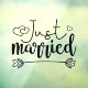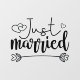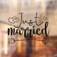 Mit diesem romantischen, weißen Aufkleber "Just Married", der einen modernen, mit liebevollen Herzen dekorierten Schriftart-Text enthält, können Sie die Neuigkeiten Ihrer Hochzeit erleben.
