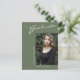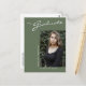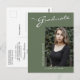 Diese moderne, elegante und dennoch schlichte Postkarte mit Abschlüssen besticht durch Designelemente moderner Texte, die mit eleganter Kalligraphie-Schrift verschmolzen sind. Das Single-Foto der Absolventen hebt die Kartenvorderseite hervor, während auf der Kartenrückseite personalisierte Textstellen für Informationen über den Abschluss und die künftige Reise angeboten werden. Weiße Schrift auf stylishem Salbei grün oder leicht anpassen den Hintergrund zu einer Farbe Ihrer Wahl. Um mehr zu sehen, besuchen Sie meinen Shop hier unter "www.Zazzle.com/LakeViewCardCo". Danke