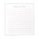Einfache Elegant Light Pink Lined Personalisierte Notepad Diese anpassbaren Notebooks sind einfach für den täglichen Gebrauch oder das Senden einer formellen Note an jemanden von Ihrem Zuhause-Büro oder Schreibtisch aus. Sie können auch eine Vielzahl von Farben aus unserem Shop für Ihre Zuhause-Office-Anforderungen auswählen. Personalisieren Sie diese Notizblöcke mit Ihrem Namen oder geben Sie sie als Geschenk und passen Sie sie mit Ihren Freunden oder Familiennamen an, damit sie sie auf ihrer Zuhause oder im Büro verwenden können.