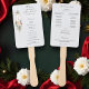 Dieses herrliche botanische Winterprogramm mit Bouquets von Elfenbein-Rose und Blume, roten Heiligbeeren, Tannen und goldenen Schneeflocken umrahmt von einem edlen Goldlabel für Ihr Monogramm auf einem hellperlengrauen Hintergrund. Enthält bearbeitbare Textfelder für Ihre Zeremonie und Hochzeitsfeier.