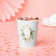 Dieser schöne botanische Papierbecher aus dem Winter mit Bouquets von Elfenbein-Rose und Blume, roten Heiligbeeren, Tannen und goldenen Schneeflocken, umgeben von einem eleganten Goldlabel für Ihr Monogramm auf einem blassperlengrauen Hintergrund. Enthält bearbeitbare Textfelder.