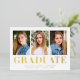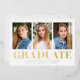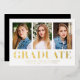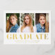 Mit dieser stilvollen und modernen Ankündigung zum Abschluss feiern Sie den Erfolg Ihres Absolventen. Drei persönliche Fotos sind in knalligem Weiß gerahmt und mit einem "Graduate" in fett gedruckter Goldfolie versehen. Diese elegante Multi-Foto-Abschluss-Ankündigung ermöglicht es Ihnen, die Vorderseite mit dem Namen des Absolventen, Schulname und Abschluss Jahr für eine personalisierte Touch anpassen. Diese Goldfolie-Ankündigung, die sowohl für Absolventen der Highschool als auch für Absolventen der Uni geeignet ist, verleiht Ihrer großen Ankündigung einen raffinierten Glanz und macht sie zu einem Sake für die kommenden Jahre.