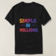 Das Bild zeigt ein flaches Vektordesign eines T - Shirt mit der Phrase "Simple in Millions", geschrieben in einem kühlen, bunten Schriftart. Der Text ist groß und auf dem Shirt zentriert, und er ist von einer Vielzahl von bunten Formen und Mustern umgeben. Das Gesamtbild ist spielerisch und auffällig, und es würde sich sicher auf einem T - Shirt abheben.