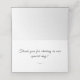Die Vorderseite ist mit einem weißen Hintergrund zur Tischnummer versehen, der oben in einem eleganten, silberfarbenen Schriftart verlassen wird. Das Zentrum zeigt eine dünne, silberfarbene Linie für den Namen des Gastes. Auf beiden Seiten wird ein delikater blüh abgebildet. In der rechten oberen Ecke wird ein silberfarbenes Kreuz angezeigt. Nachstehend werden die Vornamen der Ehepaare in einem übersichtlichen Ausdruck angezeigt. Inside Design besteht aus Ihrer Botschaft der Dankbarkeit über einem delikaten blüh. Der Hintergrund ist weiß. Ebenfalls in Champagner-Rosa und Koordinaten mit der "Simply Catholic Wedding Suite" erhältlich.