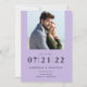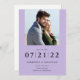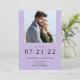 Diese einfache Save the Date Karte bietet ein Foto auf der Vorderseite und eine auf der Rückseite. Der Hintergrund ist leicht lila, und das Hochzeitstermin erscheint groß in schwarz.
