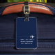 Ein kleines, weißes Flugzeug und der Name des stilvollen Reisenden, diskret auf einem dunkelblauen Sackschild gedruckt... Sondertext "Reise die Welt" ... eine nette Idee, Ihre Taschen auf Reisen zu identifizieren.
