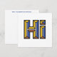Wenn Sie eine lustige Möglichkeit suchen, in der Touch bleibe und Freunde und Familie zu begrüßen, dann ist diese kühne, farbenfrohe Karte das Richtige. Dieses Design sagt "Hi" in großen, fetten, bunten Maßbuchstaben mit Farbfeldern, die an ein Piet-Mondrian-Gemälde erinnern. Die Rückseite dieser Karte kann mit Ihrem Namen oder mit dem Namen eines anderen personalisiert und als Geschenk gegeben werden. Dieses Design ist in 3 weiteren Farbvarianten erhältlich, besuchen Sie bitte unseren Shop für weitere Details zu sehen. Optional sind auch weiße Umschläge erhältlich.