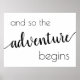 Einfach monochrome Schwarz-Weiß-blühtest horizontal "und so beginnt das Abenteuer" Dusche, Party oder Empfang Tafelschilder mit einem lustigen, lässigen, handgeschriebenen Drehbuch. Das klassische Design beinhaltet ein modernes, handhabbares Offerttipografie-Overlay. Der hübsche Schriftart mit einer individuell anpassbaren Hintergrundfarbe macht es einfach, sich jedem Thema anzupassen. Für andere Farben oder passende Produkte, besuchen Sie bitte den JustFharryn Zazzle Store, oder kontaktieren Sie den Designer, c/o fharryn@yahoo.com Alle Rechte vorbehalten. #zazzlemade