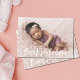 Eine einfache, moderne Geburtsankündigung mit dem Namen eines Säuglings in weißem Text auf der Vorderseite und der Geburtsinformation auf der Rückseite.