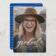 Ein einfaches klassisches Skript "graduate" in Weiß betont einen Single senkrechten Foto Ihres Abschlusses. Diese Ankündigung des Abschlusses funktioniert sowohl für Unis- als auch für High School-Absolventen und ist einfach genug, um Ihr Foto glänzen lassen. Es ist ein zeitloses Design und verfügt auch über einen gestreiften Backer mit einer anpassbaren Farbe (Standard ist ein klassischer Schatten von hellblau).