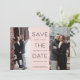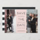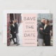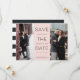 Moderne Save the Date Schwarz-Schwarz-Fotokarte mit serifenlosen und kursiven Schriftzeichen, mit Namen, Hochzeitstermin und Ort vermischt mit "Save the Date". Der Text wird auf einem pastellrot-rosa Hintergrund zentriert, der zwei Ihrer beliebtesten vertikalen oder portrait-orientierten Verlobung-Fotos zerteilt. Personalisieren Sie Ihre Einladung und/oder Hochzeitswebsite ganz unten. Eine schicke Save the Date Wahl für moderne Paare mit minimalistischer Ästhetik.