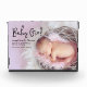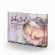 Dieser Foto-Block mit einem modernen und eleganten Skript für "baby girl" kann leicht mit der Vorlage personalisiert werden mit dem Foto und Babygeburtsstatus Informationen (Name, Gewicht, Geburtsdatum, Länge und Ihre Namen). Ein schöner Sake für Sie und für die Familienmitglieder, die gespannt auf die Geburt Ihres kleinen Mädchens gewartet haben. Ein besonderes Geschenk, das von Großmüttern, Großvätern, Tanten, Onkeln und Pateneltern geschätzt wird. Herzlichen Glückwunsch zu Ihrem neuen Freudenbündel.