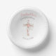 Elegante Papierschalen für Mädchen mit einem Blumenkreuz auf einem einfachen weißen Hintergrund. Personalisieren Sie Ihre Daten mit Namen, Text und Datum.