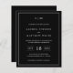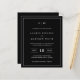 Einfache, preiswerte Hochzeitseinladung mit modernem und elegantem Design mit zwei Buchstaben Monogramm oben, einem kühnen Datumslayout und Ihren Details, umgeben von einer dünnen Grenze. Alle Designelemente sind auf schwarzem Hintergrund weiß und können im Designbearbeitungstool geändert werden. Ein elegantes und stilvolles Design, das sich ideal für ein minimalistisches Paar eignet.
