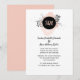 Minimalistische Einladung zur Hochzeit, in Weiß mit einem Spritzer von Pfirsichpfirsichfarben, oben, mit einer einfachen schwarzen Blumendekoration. In einem schwarzen Textbereich befinden sich die Initialen von Braut und Bräutigam in Pfirsich. Der Rücken wird in einem massiven, rötlichen Pfirsich ausgeführt. Personalisieren Sie den benutzerdefinierten Text für Ihren besonderen Tag.