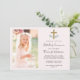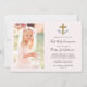 Einfaches und modernes Aquarellblatt Eukalyptusblatt mit einem goldenen Farbkreuz und moderner Schriftzeichen zuerst in Heiliger Kommunion. Diese Einladung enthält das Foto Ihres Kindes auf der Kartenvorderseite und einen pastellfarbenen, rosa Hintergrund. Dieses wunderschöne Design ist perfekt für diesen Christlichen religiösen Anlass.