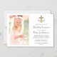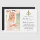 Diese Christliche religiöse Einladung enthält Aquarelleukalyptus-Blätter mit einem goldenen Farbkreuz und Handschrift-Typografie. Dieses trendige rustikale Design schließt das Foto des Kindes mit ein und eignet sich perfekt für den Anlass der ersten heiligen Kommunion.