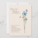 Simple Blue Wildblume Plot Drehung Wedding Save the Date Card - Diese rustikale Hochzeitseinladung verbindet minimalistische Eleganz mit Blüten der Wildblume, blauen Touchs und einem subtilen Schmetterlingsmotiv für ein einzigartiges botanisches Thema.